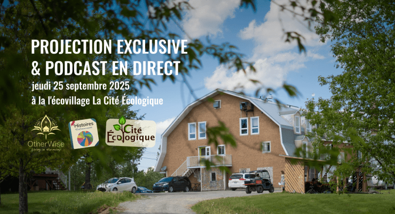 Cet été, j’ai vu passer une projection en primeur du premier épisode. J’avais cliqué « intéressé », et Jérémie m’a écrit en voyant que je suis pas mal impliqué dans le mouvement au Québec. Il m’a même invité à camper sur place. Finalement je pouvais pas y aller, alors j’ai proposé qu’on organise un événement semblable dans mon écovillage… et qu’ils passent aussi au podcast.