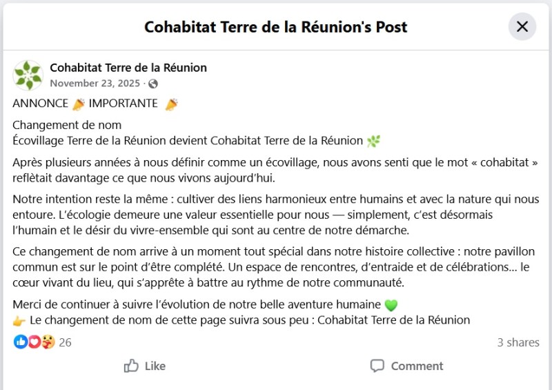 Terre de la Réunion existe depuis 2015, mais s’identifiait plutôt comme un écovillage jusqu’à l’automne 2025. Je vais donc utiliser 2025 en tant qu’année d’établissement de ce cohabitat.